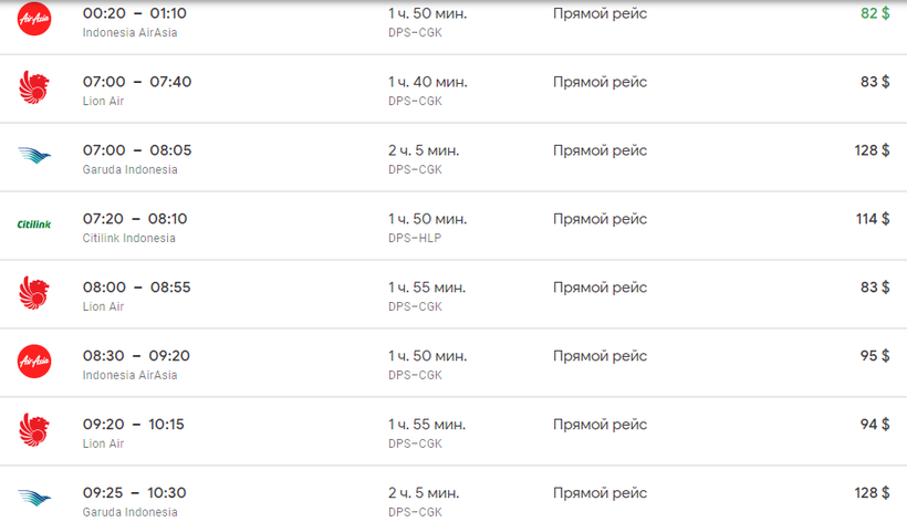 Самолеты из Денпасара в Джакарту вылетают с 07:00 утра до 00:20 примерно 2 раза в час, так что по маршруту ежедневно совершается около 50 рейсов. А свой путь до Джакарты самолеты преодолевают в среднем за 2 часа.