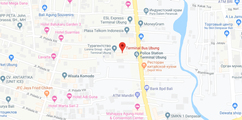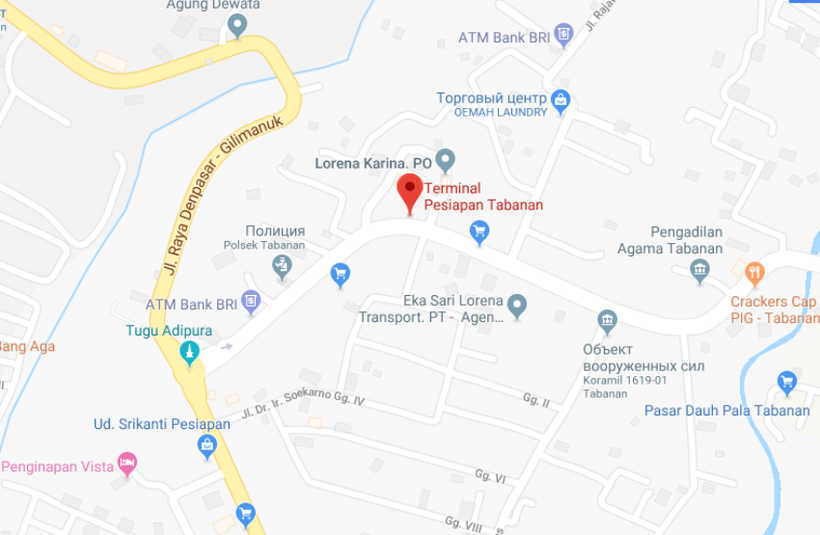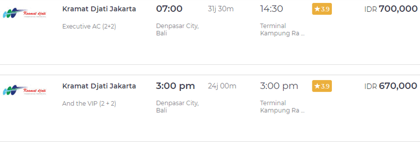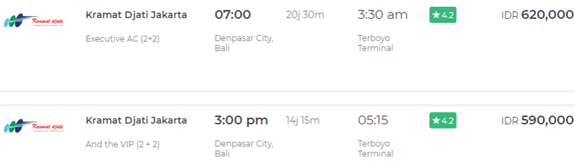 Доехать с балийского Денпасара в Джакарту можно только прямыми автобусами перевозчика Kramat Djati Jakarta. Автобусы из Денпасара отправляются c терминала Persiapan Tabanan на Pidada 14 в 07:00 и в 15:00.