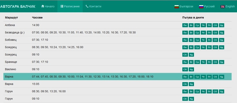 В Варну отправляется больше десяти рейсов ежедневно. Первый в 7:44 утра, последний в 18:10. В первой половине дня рейсы отправляются раз в полчаса-час. После обеда на несколько часов наступает перерыв в движении. А затем оно возобновляется примерно с тем же интервалом. Подробнее смотрите на скрине или на официальном сайте автовокзала.