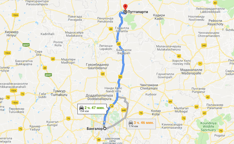 Бангалор — Путтапарти — маршрут на карте