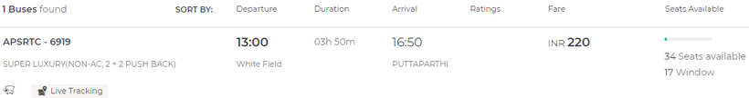 Отправляется он из Бангалора в 13:00 от остановки Whitefield Bus Stop. В пути автобус находится около 4 часов.