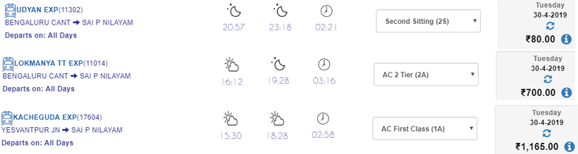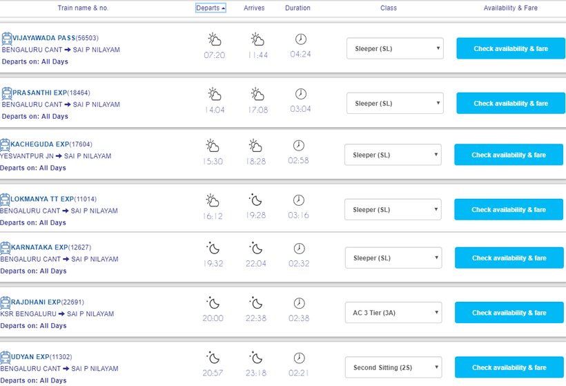Ежедневно от ж/д станции Бангалора Bengaluru Cantt, расположенной на Cantonment Railway Station Road, отправляется 7 поездов в Путтапарти. Время отправления: