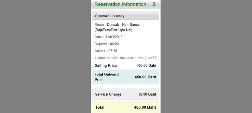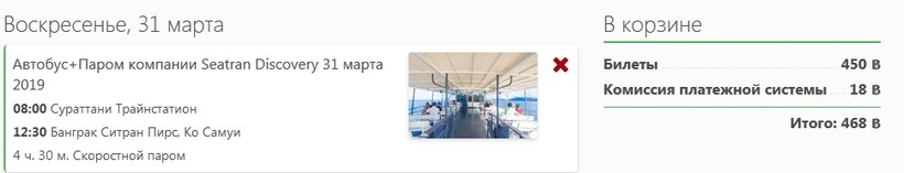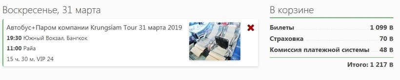 Единый билет на автобус класса VIP и паром в одну сторону стоит — 1217 таиландских батов (34 €).