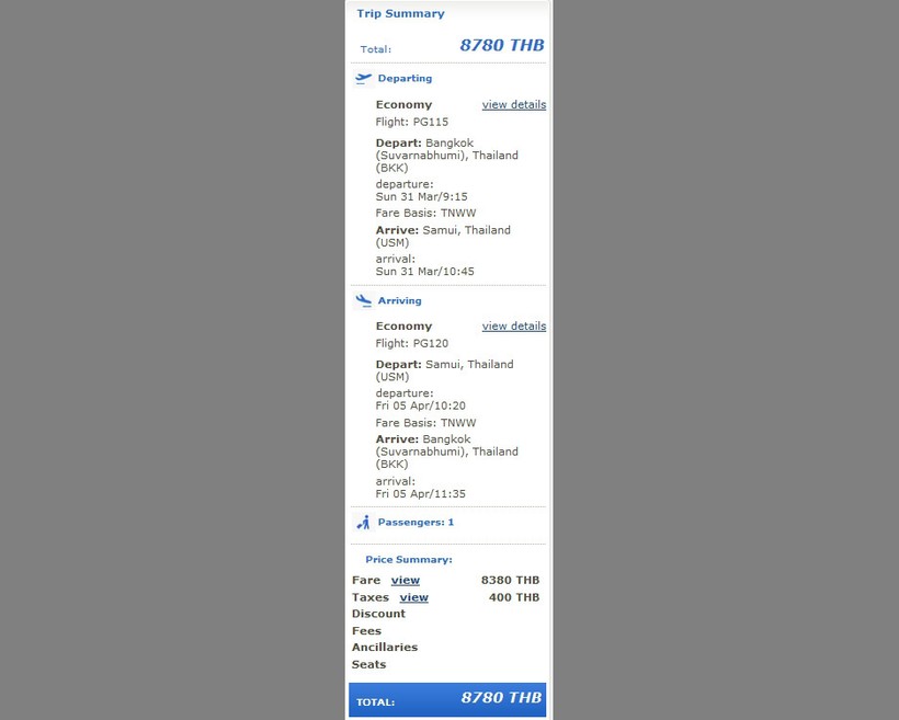 В оба конца билет для одного взрослого стоит 8780 таиландских батов (243 €).