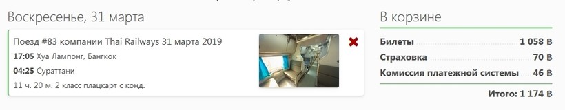Билет на поезд в одну сторону стоил 1174 батов (32,5 €).