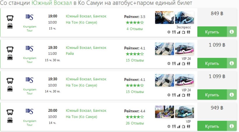 На вокзале Сураттхани можно купить общий билет на автобус и паром. Автобус едет в город Донсак, на пристань Раджа Ферри или Ситран Ферри.