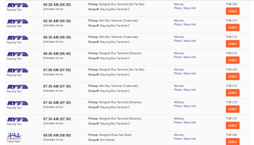 Судя по этой информации, уехать в Районг можно с 05:20 до 20:30.