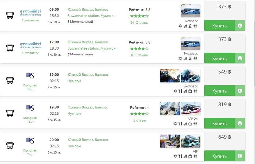 В Таиланде автобусы часто удобнее и быстрее, чем поезда. Из Бангкока в Чумпхон идут автобусы таких перевозчиков как Suwannatee и Krungsiam Tour.