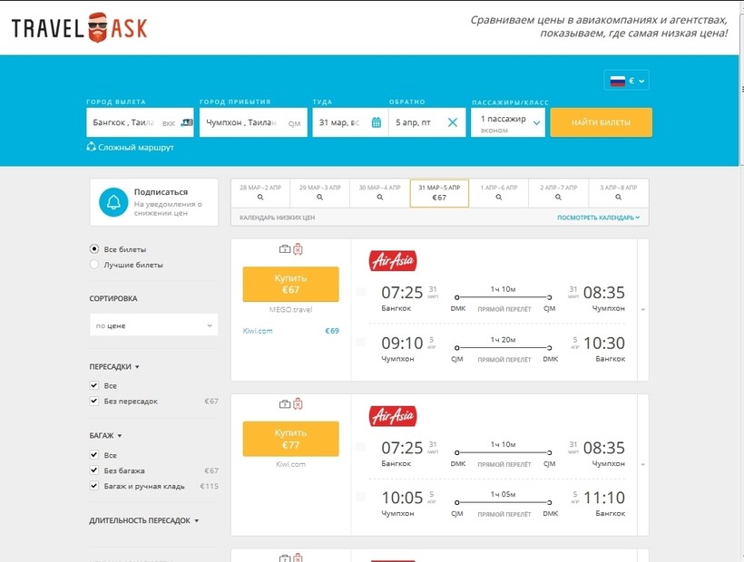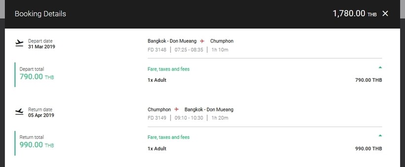 Билеты в оба конца на рейс компании Thai AirAsia стоят 1780 таиландских батов (50 €).