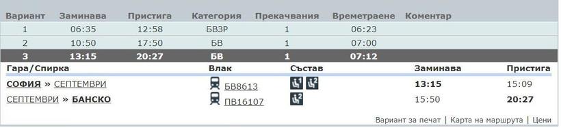 На этом маршруте без пересадки в Септември, увы, не обойтись, прямых поездов нет. Весь путь, учитывая смену транспорта, займет 6,5-7 часов, для небольшого расстояния (меньше 200 км) как-то многовато. Ежедневно есть три рейса: в 06:35, 10:50 и 13:15. Они отправляются с вокзала София-Центральная (на бул. Княгиня Мария Луиза 102А). В городе есть еще Северный вокзал, но, если ехать от него, придется сделать дополнительную пересадку на Главном вокзале. Про железную дорогу Болгарии и типы поездов в этой стране отлично написано здесь. Вокзал в Банско расположен по адресу ул. „Академик Йордан Иванов“ 1.