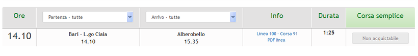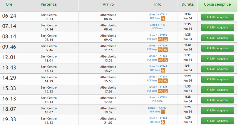 Тот же перевозчик FSE предлагает туристам и автобусные рейсы. Так как автобусные маршруты сильно большой популярностью не пользуются, то уехать таким образом можно только раз в сутки – в 14.10. Автобус отправляет с автовокзала, расположенного буквально в 50 метрах от входа на главный железнодорожный вокзал Бари. В пути нужно будет провести 1,5 часа.
