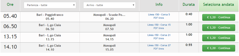 В Бари работает достаточно много транспортных компаний, поэтому при желании добраться в Монополи можно и на автобусе. Одной из таких фирм является FSE. Автобусы этой фирмы отправляются в Монополи несколько раз в день: в 05.40, 06.50, 13.15,14.10. В пути нужно будет провести около часа.