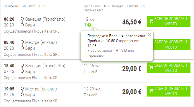 При желании добраться из Венеции в Бари можно и на автобусе компании FlixBus. В зависимости от рейса транспорт выезжает с автовокзалов Mestre или Tronchetto. Некоторые варианты прямые, другие предполагают пересадку в Болонье. Ниже привожу расписание автобусов.