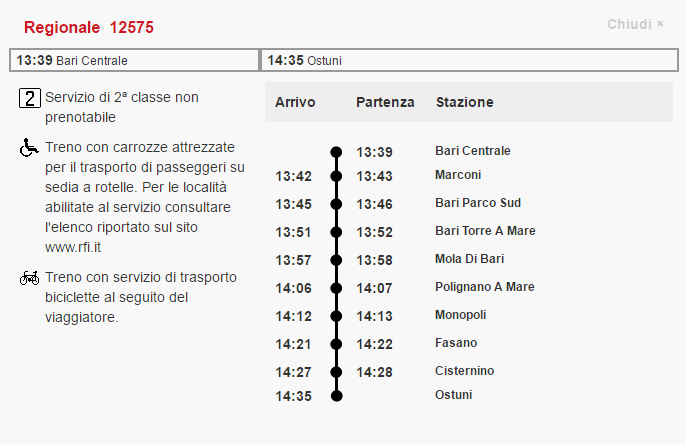 Первый поезд выезжает со станции Bari Centrale ровно в пять утра, далее в течение дня поезда курсируют с интервалом в 15-50 минут. Последний состав выезжает в сторону Остуни в 22.40. По дороге поезда делают несколько остановок, их количество зависит от категории состава. Больше всего остановок делает поезд категории Regionale, но и это не мешает добраться до конечного пункта всего за час.