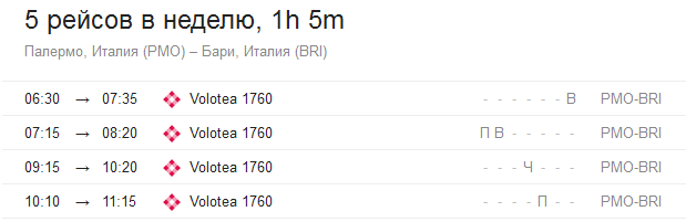 Наиболее быстрый способ добраться из одного города в другой – это самолет. И в Палермо, и в Бари есть аэропорты, между которыми налажено регулярное воздушное сообщение. Обратите внимание, что самолеты летают не каждый день, а время вылета зависит от дня недели (правда, самолеты всегда вылетают в первой половине дня).