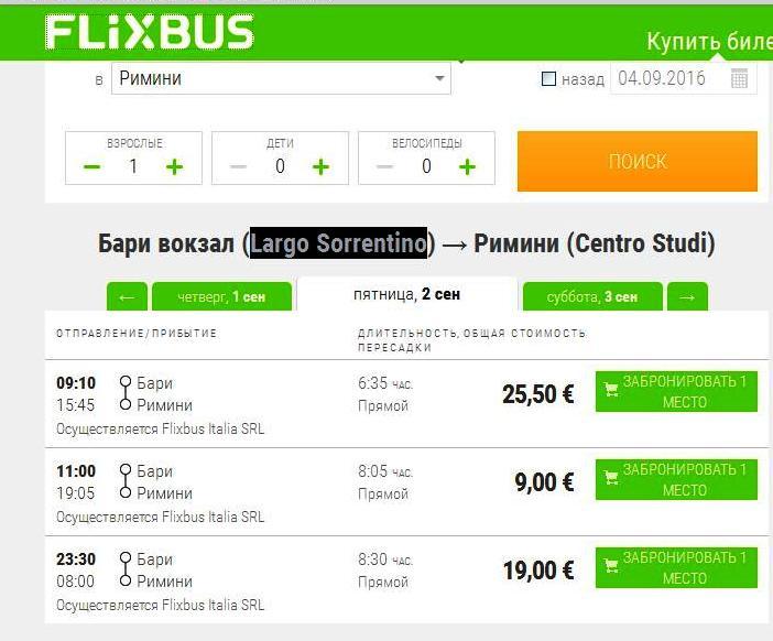 Рейсы SINDBAD . отправляются по понедельникам, средам и субботам в 5.21 утра от автостанции Бари. Через 8 часов 54 минут в 14.15 автобус прибывает к железнодорожному вокзалу Римини.