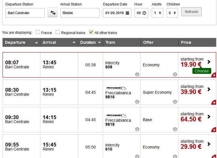 Из Бари в Римини можно легко добраться на поезде. Железнодорожные перевозки выполняются поездами компании Trenitalia. Поезда отправляются ежедневно от центрального вокзала Бари. Время поездки составит от 4 часов 45 минут до 5 часов 50 минут.
