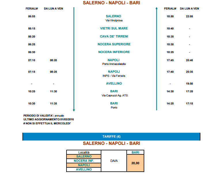 Все рейсы осуществляются двумя маршрутами: «Салерно – Авеллино – Бари» и «Салерно – Наполи – Бари». Оба рейса ежедневно совершают по одной поездке, оба рейса отправляются с автовокзала Via Vinciprova в одно время – в 06:05. Кроме времени отправления также совпадает и время прибытия – оба автобуса прибывают на автовокзал Porto в Бари в 10:30, в результате время поездки составляет всего около 4 часов.