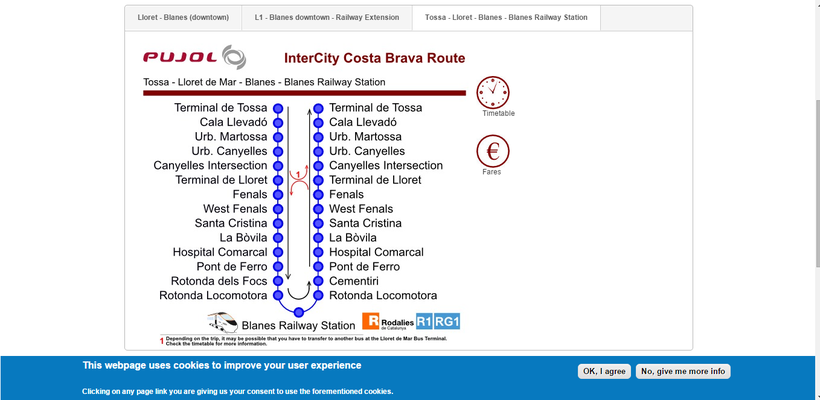 До Тосса Де Мар можно доехать с пересадкой в городе Бланес – так дорога займёт больше времени, зато можно по пути познакомиться с одним из старейших курортов Испании, возможно этот вариант кого-то заинтересует. С железнодорожной станции Placa Catalunya примерно каждый час до Бланеса отходит электричка R1, которая доезжает до места за 1 час 20 минут. Первый поезд уходит в 5.51, последний в 22.59. Погуляв по Бланесу можно сесть на автобус до Тосса Де Мар, он отходит от того же самого вокзала, куда прибывает электричка. Автобусы в Тосса Де Мар ходят очень часто – каждые 15 минут, вот тут можно посмотреть подробное расписание. Дорога от Бланеса до Тосса Де Мар занимает около 40 минут.