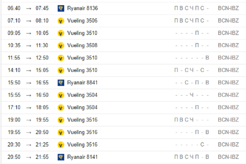 Самолёты на Ибицу отлетают почти каждый час, в пути час, расписание можно посмотреть на официальном сайте аэропорта. Или же на скрине ниже.