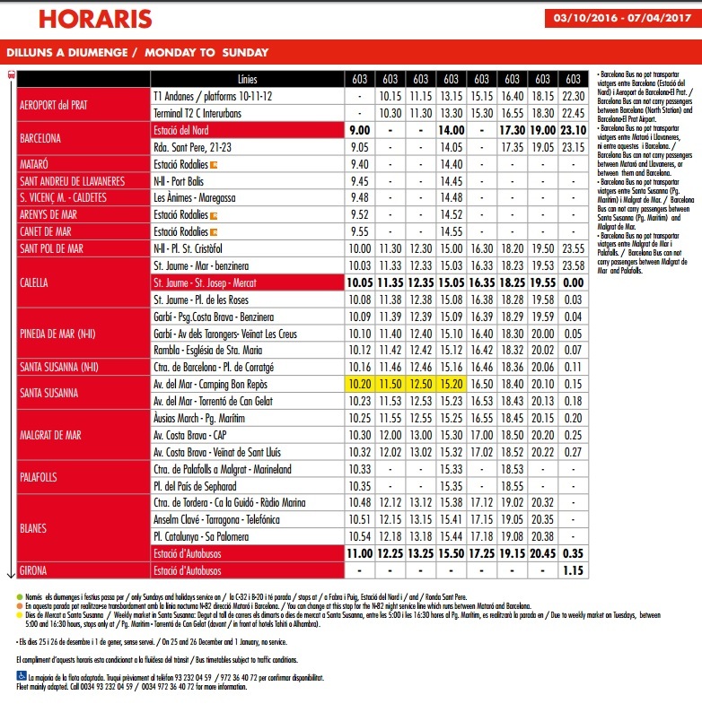 В Бланес можно доехать и на автобусе. Рейсы компании Sagales отправляются от автостанции возле аэропорта Эль-Прат и от автостанции Barcelona Nord:На сайте компании есть вся полезная информация по рейсу №603: расписание движения, маршрут и стоимость проезда. Для наглядности вот расписание движения автобусов, так понятнее, где можно сесть на автобус в Бланес:
