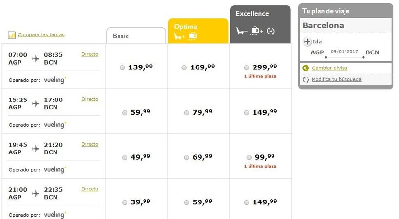 Авиаперевозчик Vueling совершает по будням 4-5 прямых рейсов в день до Барселоны, по субботам – 2, по воскресеньям – 3. Время вылетов специально не указываю, так как практически каждый месяц оно меняется. Расписание лучше всего уточнять прямо на сайте. Перелет занимает всего лишь 1 ч 35 мин.