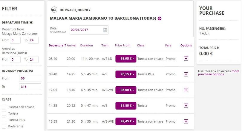 По будним дням есть 5 рейсов до Барселоны: в 08:40 (2 шт), 12:05, 14:35 и 15:55, из них 2 прямых и 3 – с пересадкой. В субботу последнего отправления нет, а в воскресенье добавлен еще один в 15:35. Нужно будет провести в дороге от 5,5 до 11,5 часов. Все поезда отправляются от вокзала Maria Zambrano в Малаге (на Explanada de la Estación), а прибывают на станцию BARCELONA-SANTS (по адресу Carrer del Rector Triadó, 75). Некоторые составы останавливаются и на других вокзалах в Барселоне.