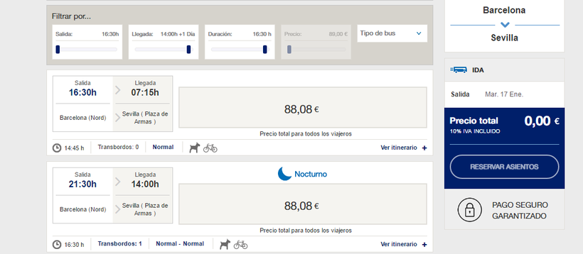 Отправка проходит с ж/д станции Барселоны Sants (Carrer del Rector Triadó, 75), прибытие на вокзал Севилья (Av. De Kansas City).