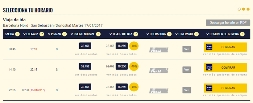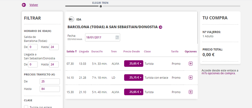 Для проезда доступны только три поезда категорий ALVIA и LD, которые отправляются с железнодорожной станции Барселоны Сантс (Carrer del Rector Triadó, 75) в 07.30, 14.10, 15.30 и прибывают на конечную остановку - ж/д станцию Сан Себастьяна, что находится по адресу Paseo de Francia, 22.
