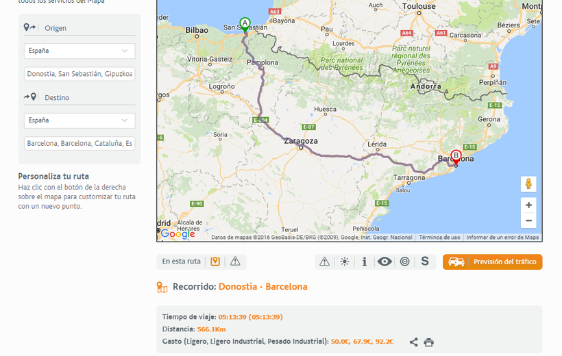 Расстояние между Сан-Себастьяном и Барселоной составляет 403 километра или 250 миль по прямой и 566 километров или 352 мили по автодорогам.