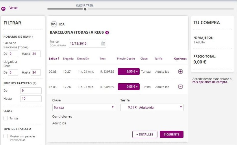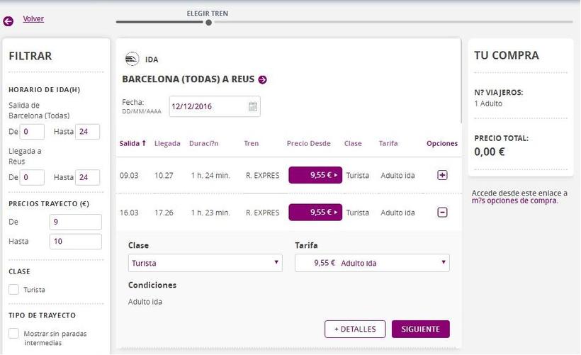Прямые поезда R. EXPRES отправляются с вокзала ESTACIO DE FRANCIA (на Av. del Marquès de l'Argentera) дважды в сутки: в 08:43 и в 15:43. Через 10 минут после отправления они прибывают на вокзал Passeig De Gracia (на одноименной улице), а еще через 10 мин – на вокзал SANTS (на Carrer del Rector Triadó, 75). То есть у вас есть возможность выехать в Реус с трех вокзалов Барселоны, что очень удобно. А еще, цена билета одинакова. Через 1:24-1:44 (смотря, на какой остановке вы сядете в поезд) состав прибудет на вокзал Реуса (на Plaça de l'Estació).