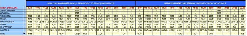 Этот способ подойдет тем, кто прилетел в Барселону на самолете, а потом сразу планирует добираться до Реуса. Автобусы фирмы Empresaplana отправляются от терминала 1 с платформ 7-11 несколько раз в день по будням: в 09:10, 13:55, 16:25, 17:40, 19:55 и 22:55. По субботам расписание отличается (см. правую часть скрина). А по воскресеньям есть такие рейсы: 09:10, 13:55, 16:25, 18:55 и 22:55. Также хочу предупредить, что зимнее и летнее расписание могут не совпадать. Поэтому свои даты лучше проверять прямо на сайте. Эти автобусы доезжают до Реуса за 2 ч 45 мин.