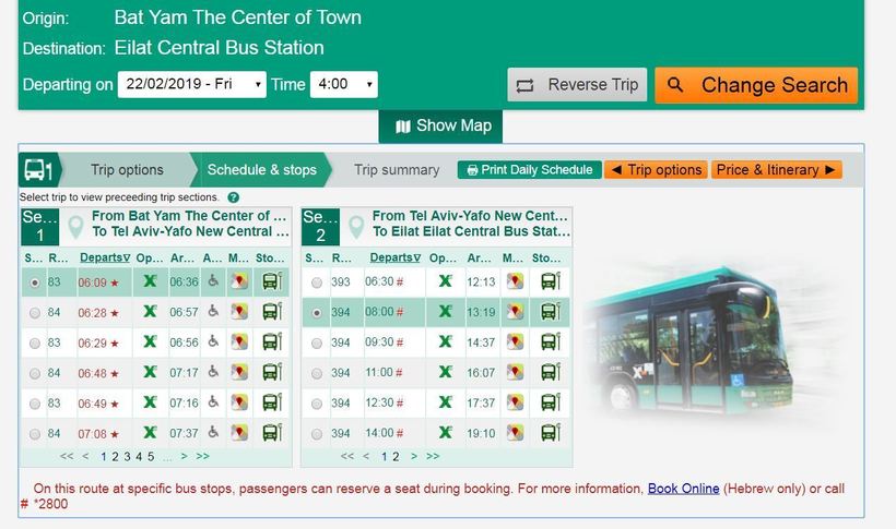 На автобусе добраться до Эйлата тоже можно, но потребуется делать пересадку. Для того, чтобы разобраться в премудростях расписания, предлагаю посетить сайт автобусного оператора Egged. Вот скриншот оттуда: