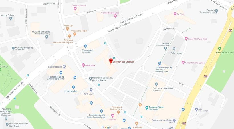 Далее на этой же станции следует пересесть на автобус под № 393 или № 394, который и отвезет в Эйлат. В Эйлате автобус прибывает на местный автовокзал, расположенный по бульвару Ха-Тмарим.
