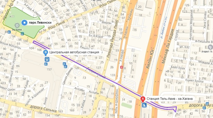 Чтобы уехать в Иерусалим на автобусе, вам нужно добраться до Центрального автовокзала Тель-Авива. Сначала езжайте на автобусе № 42 до ж/д станции ха-Хагана. Билет вам обойдется в 6 шекелей (110 рублей, дорога займет 35 минут), там до автобусной станции (она располагается на улице Levinsky street, 108) пройдетесь пешком (променад займет 12 минут, не больше)