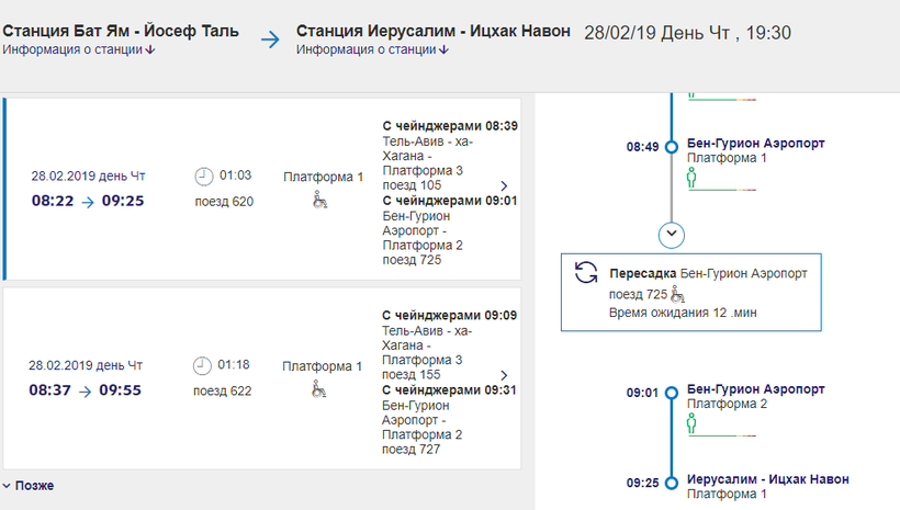 Учитывайте тот факт, что из аэропорта поезда до Иерусалима курсируют с половины седьмого утра и до половины восьмого вечера. Интервал движения от шести до двадцати минут. Заходите на официальный сайт Израильских железных дорог и там вы сможете, вбив начальную и конечную станцию, узнать все расписание. Сайт имеет русскоязычную версию, так что проблем у вас не возникнет. Все станции я вам указала. Также на всех перронах работают сотрудники железных дорог, они вам подскажут, на какую платформу дальше пересаживаться, если сами не поймете.