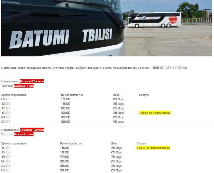 Автобусный перевозчик Metro Georgia ежедневно совершает 5-6 рейсов в день, ниже на скрине видно подробное расписание. Отправляются автобусы от автовокзала Батуми (нового) по адресу ул. Гоголя, 1. Через 6-7 часов пути вы прибудете на автовокзал Ортачала в Тбилиси, ул Гулия. №1. Сервис в салонах довольно-таки цивилизованный и высокий: бесплатные напитки (водичка, чай, кофе), бесплатный вайфай (водитель дает логин/пароль по вашему требованию) и мини-компьютеры на спинках сиденья прямо перед вами.