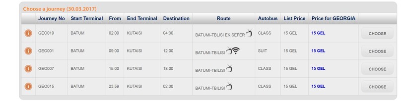 Как видно, в сутки есть 4 рейса. Преимуществом является возможность отправление из Батуми в 2 часа ночи, наличие на борту телевизора (а на одном из автобусов есть еще и интернет). От аэропорта можно взять такси или поехать на автобусе. Почитать про это можно вот здесь.