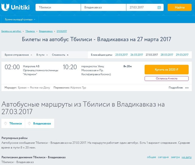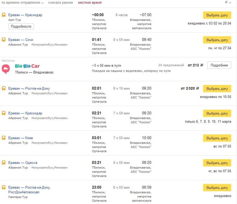Достоверно точно ездят проходящие рейсовые автобусы Ереван-Ростов-на-Дону армянского перевозчика Avazar Bus. Они отходят от гостиницы Астерион, что напротив автовокзала Ортачала в Тбилиси в два часа ночи. А через 8,5 часов прибывают на автостанцию Владикавказа возле заправочной станции Космос (на пересечении Московской улицы с проспектом Коста).