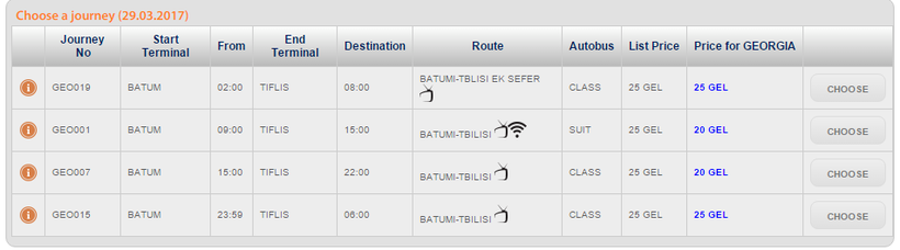 Вот пример расписания автобусов от Батуми до Тбилиси.