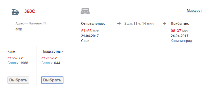 Билеты на поезд Сочи – Калининград стоили от 2000 рублей за плацкарт и примерно от 5000 за билет в купе.