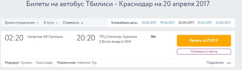 От автовокзала в 2:20 каждый день отправляется автобус Ереван-Краснодар или Ереван-Анапа. Из Тбилиси в Краснодар автобус едет 18 часов.