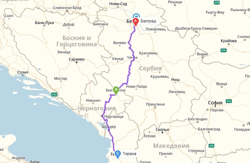 Между этими населенными пунктами почти 600 километров. Прокладывайте маршрут через Черногорию, а не через частично признанную республику Косово (россиянам тут для проезда понадобится виза просто). Я ездила через города: