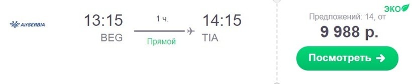 Билеты до Тираны от 15900 динаров (от 9990 рублей или 134,5 евро).
