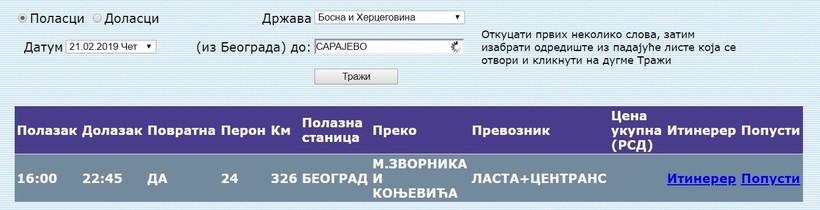 Автобус в Сараево отходит с Главной Белградской автостанции, которая располагается на улице Железничка, 4. Отбытие ежедневно в 16:00 с 24 перрона. В Сараево вы прибудете в 22:45 (весь путь займет 6 часов и 45 минут). Автовокзал в столице Боснии и Герцеговины расположен в северной части города, но автобус вечером уже до него не едет, вас высадят возле остановки «Зворник и Коньевича».