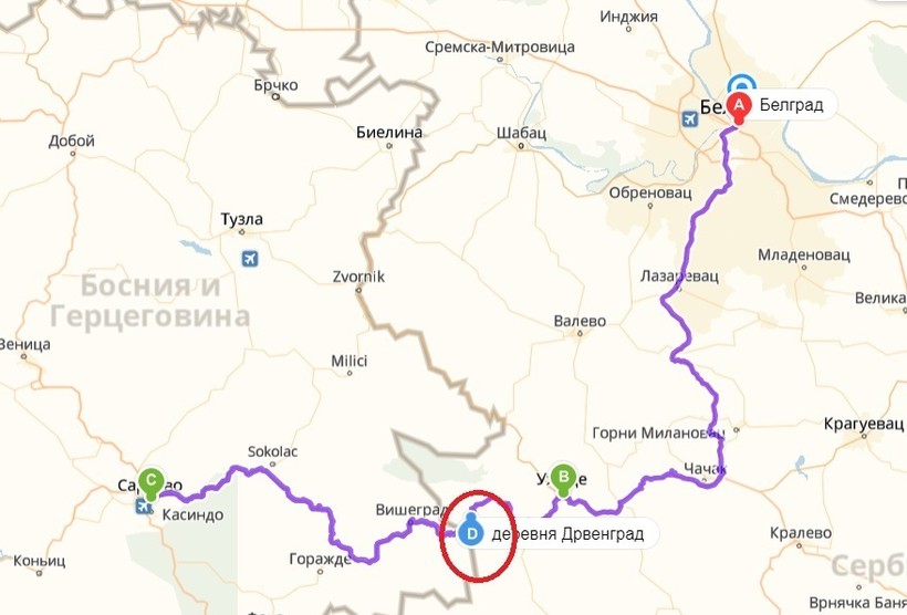 От Белграда до Сараево по трассе 390 километров. Что касается времени за которое можно преодолеть это расстояние, то тут все зависит от времени года. Зимой многие дороги немного занесены снегом и ехать тут быстро не получится, так что в этот период на дорогу нужно закладывать часов девять примерно. Летом можно уложиться и в семь часов. На большей части трассы будет двухполоска, покрытие тут вполне приличное, так что за это беспокоиться не стоит (заправок также хватает). Также до Сараево очень живописная дорога, вы проедете и горы, и очень красивые каньоны. Еще по пути я вам советую заехать в деревню Эмира Кустурицы (отметила ее на карте).
