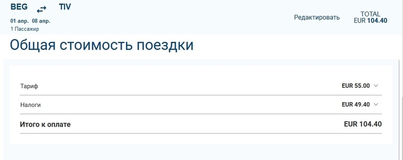 Билет AirSerbia до Тивата стоит 12300 RSD (104 €).