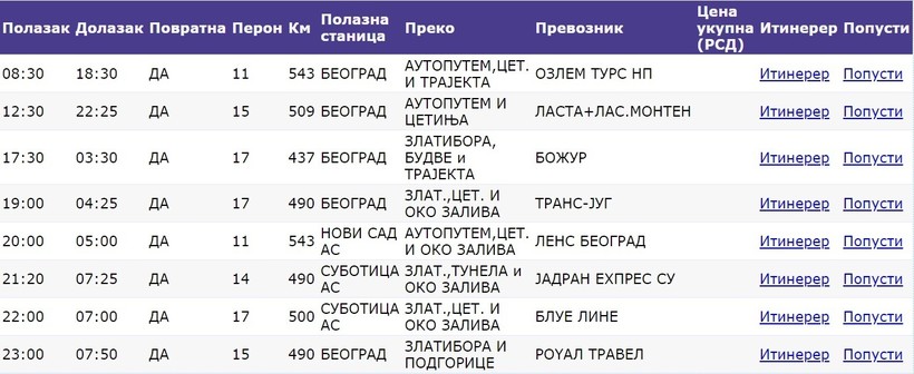 Белградская автобусная станция находится на улице Железничка, 4. Ежедневно отсюда до Подгорицы отбывает восемь автобусов. Есть один рейс утром, один в обед, остальные автобусы уходят вечером. В дороге вы проведете от девяти часов.