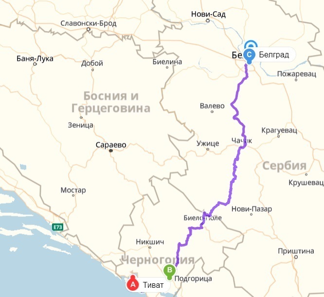 Тиват — Белград — маршрут на карте