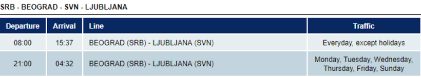 Из Белграда в столицу Словении ежедневно можно попасть поездом № 414, который курсирует по маршруту «Белград — Цюрих» через Любляну. Отправляется поезд из Белграда в 10:35 и прибывает в Любляну через 10,5 часов — в 20:57.